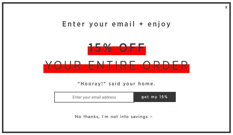“No thanks, I’m not into saving” guilts the person to enter their email address and get 15% off even if the person doesn’t plan on buying from the website.